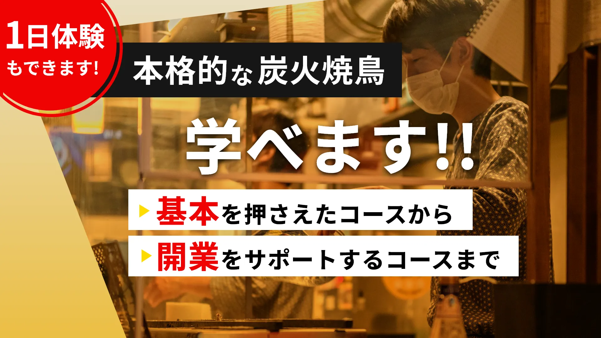 本格的に焼き鳥屋を開業したい方におすすめ。一番人気のコースです。 焼き鳥の基本から実践、さらに逸品料理もお教えします。